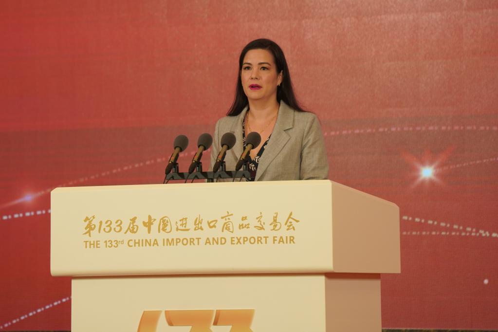 第133屆廣交會(huì )開(kāi)幕式上,珍妮弗·帕頓代表科佩爾公司發(fā)言。新華社記者魏弘毅 攝