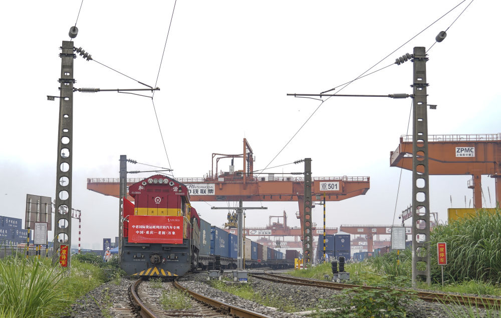 中老國際貨運班列慶鈴汽車(chē)專(zhuān)列從重慶團結村車(chē)站駛出(2022年6月8日攝)。新華社記者 黃偉 攝