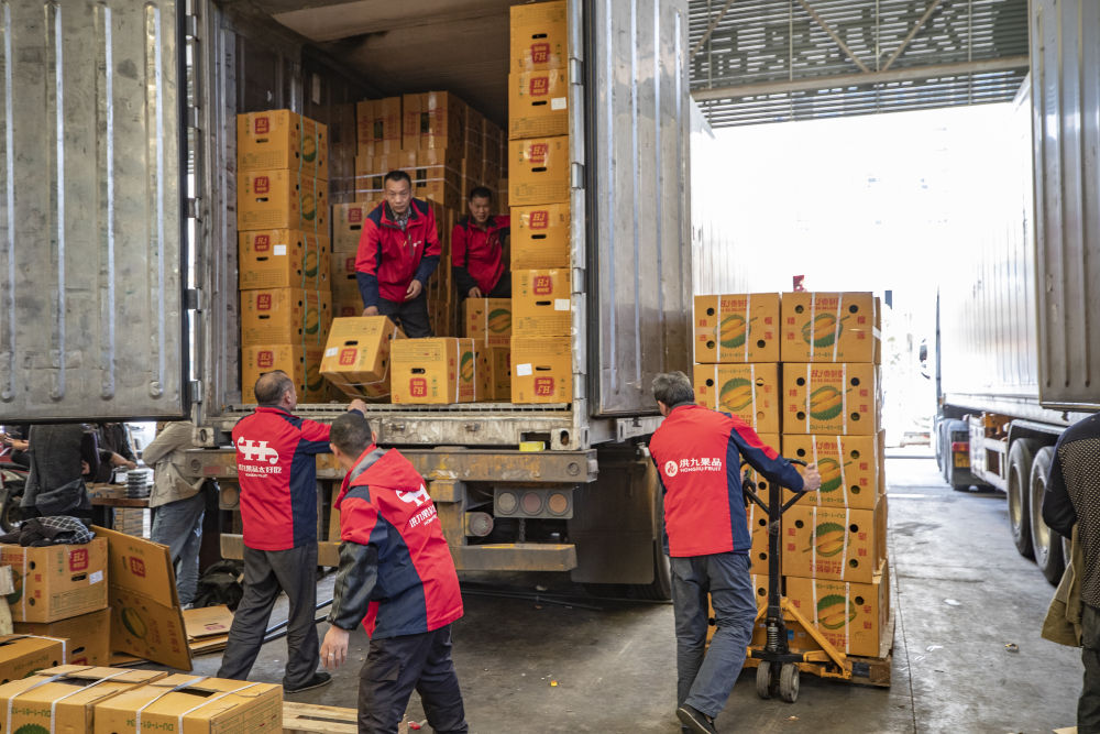 在重慶市江津區雙福農貿城,洪九果品的工作人員在搬運從泰國運輸過(guò)來(lái)的榴蓮(2022年4月19日攝)。新華社記者 黃偉 攝