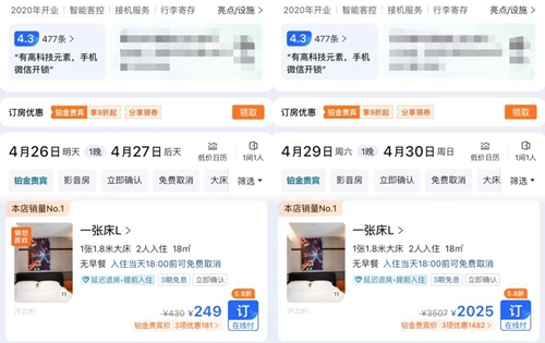 西安熱門(mén)旅游景區大雁塔旁的一家精品酒店,18平方米的大床房平日價(jià)249元,4月29日、4月30日和5月1日入住的價(jià)格均高達2025元,幾乎在平日價(jià)后面直接加了個(gè)零。有受訪(fǎng)者表示,四位數住這樣的酒店,實(shí)在無(wú)法接受。專(zhuān)家建議,節假日酒店房?jì)r(jià)上漲雖然受市場(chǎng)供需影響,但也需要考慮漲價(jià)幅度的合理性,劇烈的酒店價(jià)格波動(dòng)不利于維護市場(chǎng)的良好秩序。