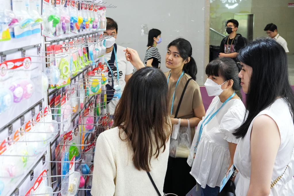 印尼采購商朱麗婭·哈桑(右二)一家四口在第133屆廣交會(huì )二期孕嬰童展區了解嬰兒用品(4月23日攝)。新華社記者 劉大偉 攝
