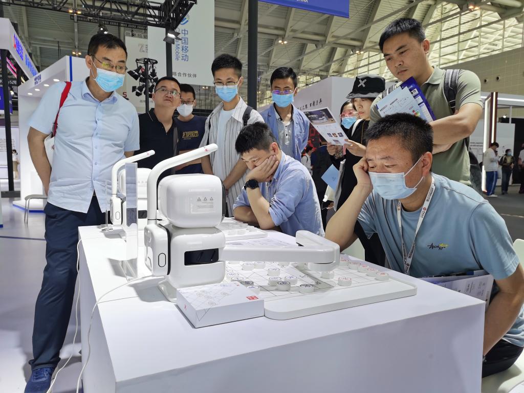 圖為觀(guān)眾在第七屆世界智能大會(huì )上與下棋機器人“互動(dòng)”。新華社記者劉惟真 攝