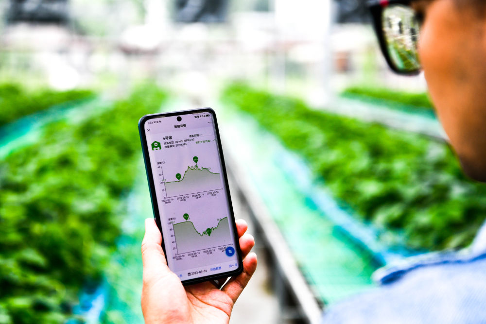 農技人員在貴陽(yáng)市開(kāi)陽(yáng)縣南江蔬菜良種繁育中心展示手機“惠農云助手”上育苗大棚內溫濕度的記錄(2023年5月23日攝)。新華社記者 楊文斌 攝