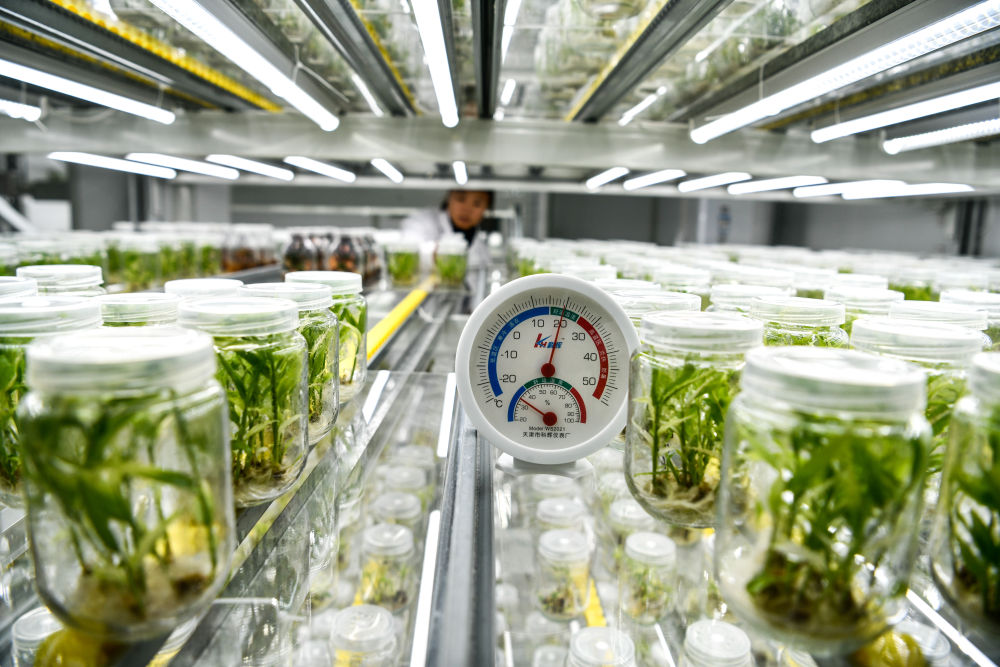 工作人員在貴陽(yáng)市開(kāi)陽(yáng)縣南江蔬菜良種繁育中心的組培中心查看姜苗生長(cháng)情況(2023年5月23日攝)。新華社記者 楊文斌 攝