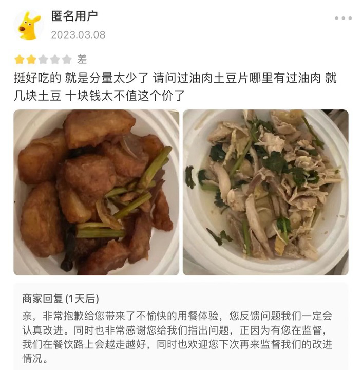 太原市萬(wàn)象城、親賢街多家餐飲企業(yè)經(jīng)營(yíng)者表示,“同等條件下,消費者消費大份菜、一份菜價(jià)格要低于兩份小份菜、半份菜的價(jià)格之和,一些消費者認為不劃算,讓小份菜、半份菜推廣面臨困難?!痹谀惩赓u(mài)平臺,記者瀏覽發(fā)現,一些給予差評的消費者評價(jià)留言稱(chēng),小份菜的分量和價(jià)格不成正比、“量少價(jià)貴”等。