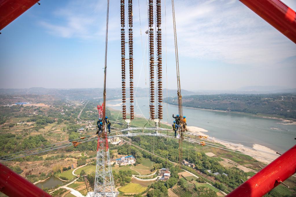 2022年9月13日,工人在白鶴灘-浙江±800千伏特高壓直流輸電線(xiàn)路工程(重慶段)江津長(cháng)江大跨越施工現場(chǎng)作業(yè)。