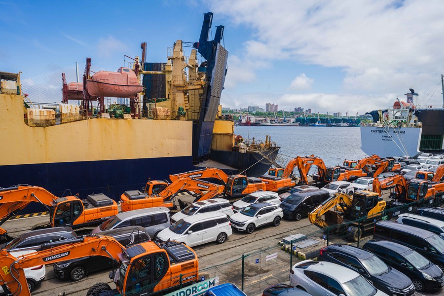 這是2022年6月16日在俄羅斯符拉迪沃斯托克港口拍攝的從貨輪上卸下來(lái)的日本二手車(chē)。新華社發(fā)(郭飛洲攝)