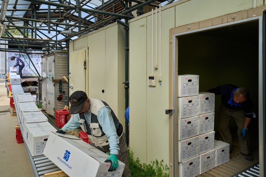 4月5日在日本埼玉縣埼玉市的園藝中心,經(jīng)營(yíng)花卉公司的小西武(左)和工人將從中國云南進(jìn)口的鮮花運進(jìn)倉庫。新華社記者張笑宇攝