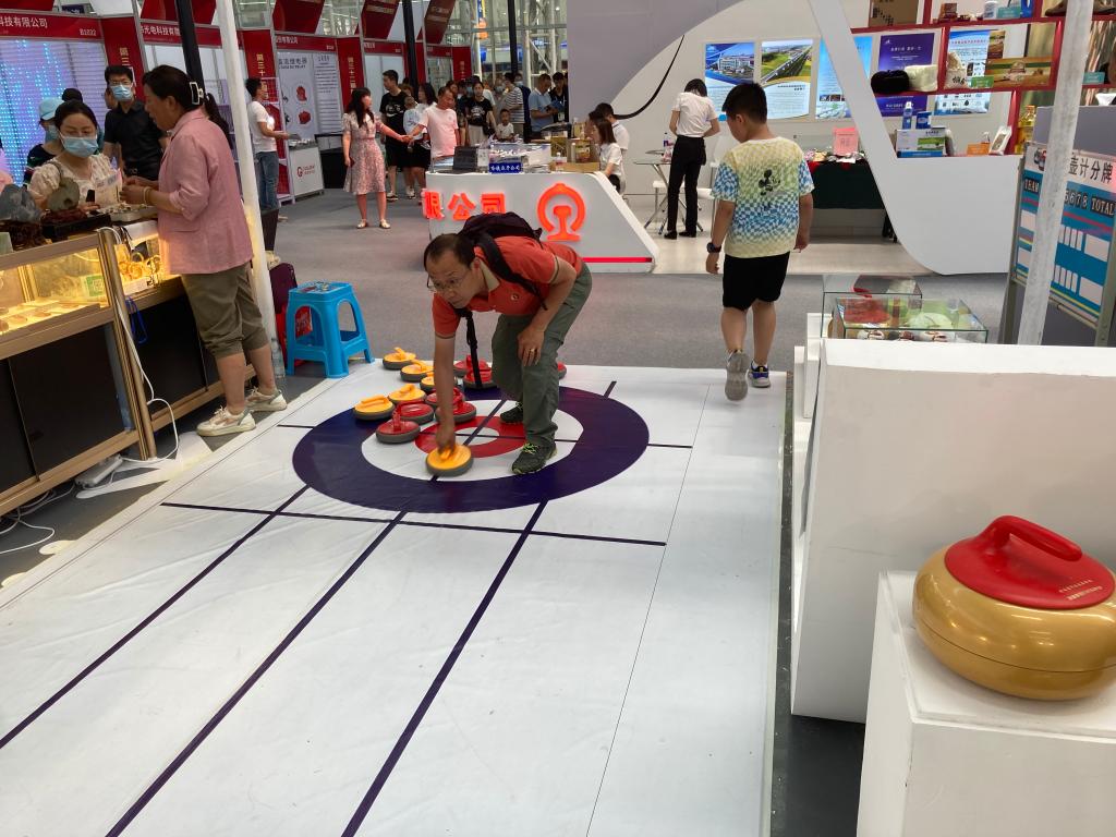 6月18日,一名參觀(guān)者在第三十二屆哈洽會(huì )體驗旱地冰壺。新華社記者 金地 攝