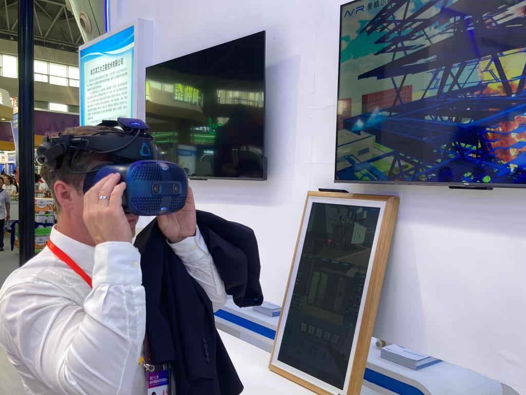在黑龍江省專(zhuān)精特新企業(yè)哈爾濱愛(ài)威爾科技有限公司展位前,一名參觀(guān)者戴著(zhù)VR眼鏡,在1:1還原的工廠(chǎng)場(chǎng)景中沉浸式參觀(guān)廠(chǎng)房車(chē)間。
