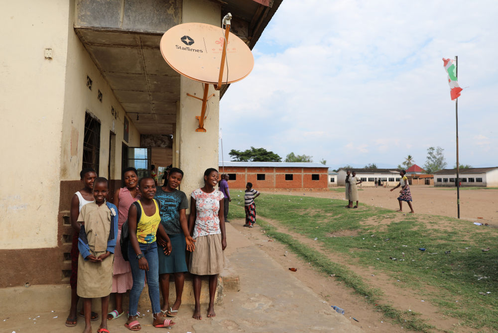 2022年10月31日,在布隆迪布瓊布拉鄉村省穆蒂姆布齊的一座村莊,當地村民與中國援建布隆迪“萬(wàn)村通”項目安裝的衛星電視接收器合影。新華社記者 董江輝 攝