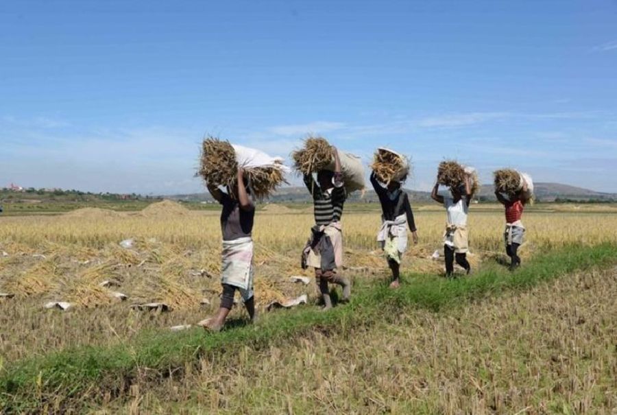 2023年5月12日,在馬達加斯加首都塔那那利佛附近馬希奇鎮的中國國家雜交水稻工程技術(shù)研究中心非洲分中心,當地農民在雜交水稻高產(chǎn)示范田內收割水稻。新華社發(fā)(西塔卡·拉喬納里松攝)