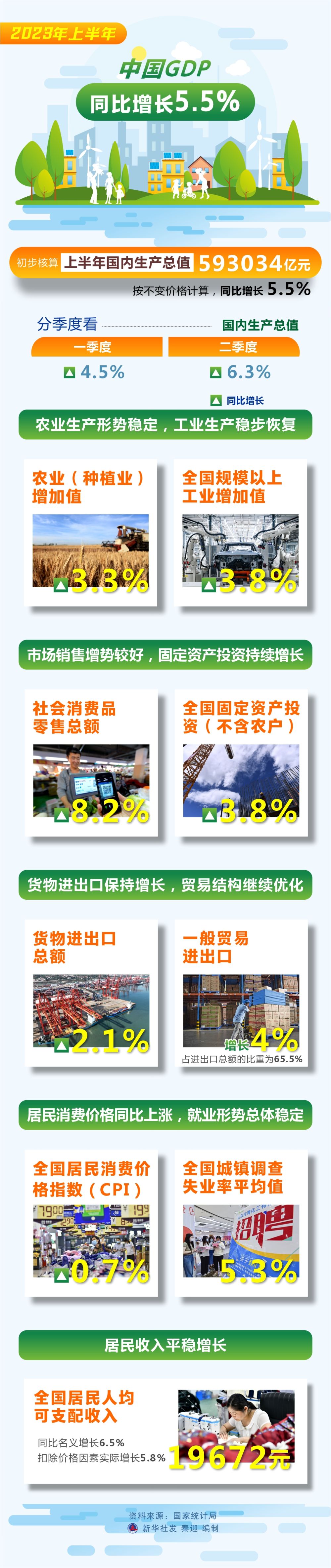 翻開(kāi)半年報,國內生產(chǎn)總值比去年同期增長(cháng)5.5%,社會(huì )消費品零售總額同比增長(cháng)8.2%,第三產(chǎn)業(yè)增加值同比增長(cháng)6.4%……多項指標顯示,我國經(jīng)濟運行延續恢復向好態(tài)勢,同時(shí)物價(jià)、出口等部分指標增速放緩也引發(fā)關(guān)注。