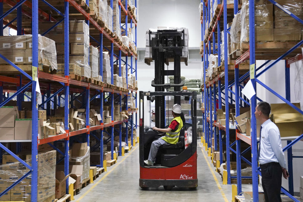 在上海虹橋商務(wù)區保稅物流中心(B型),工作人員在運輸跨境電商貨物(5月13日攝)。新華社記者 馬寧 攝