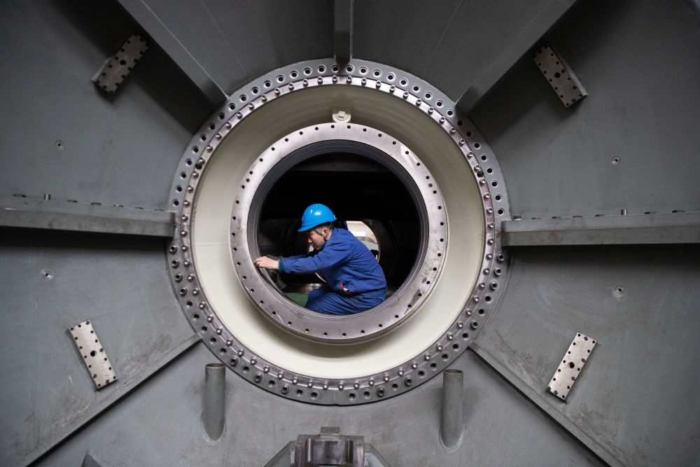 工人在哈電集團哈爾濱汽輪機廠(chǎng)有限責任公司車(chē)間內生產(chǎn)作業(yè)(4月28日攝)。新華社記者 張濤 攝
