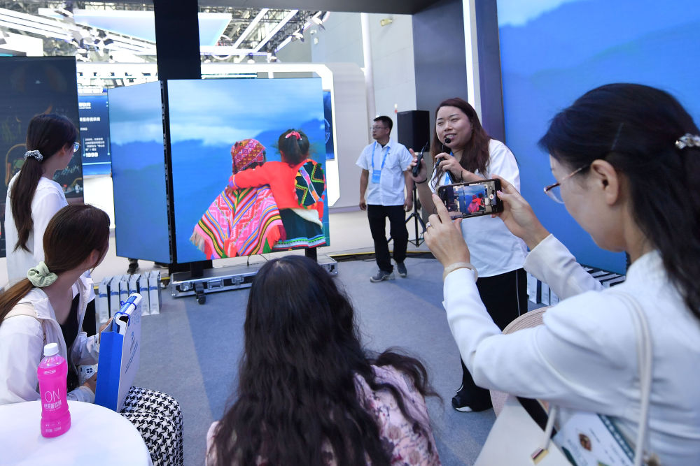 9月6日,在2023中國國際數字經(jīng)濟博覽會(huì )上,工作人員向參觀(guān)者介紹便攜式升降折疊屏。新華社記者 駱學(xué)峰 攝