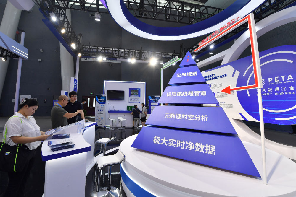9月7日,在2023中國國際數字經(jīng)濟博覽會(huì )上,北京晟通兆合科技有限公司工作人員(左二)向參觀(guān)者介紹極限超算系統。新華社記者 駱學(xué)峰 攝