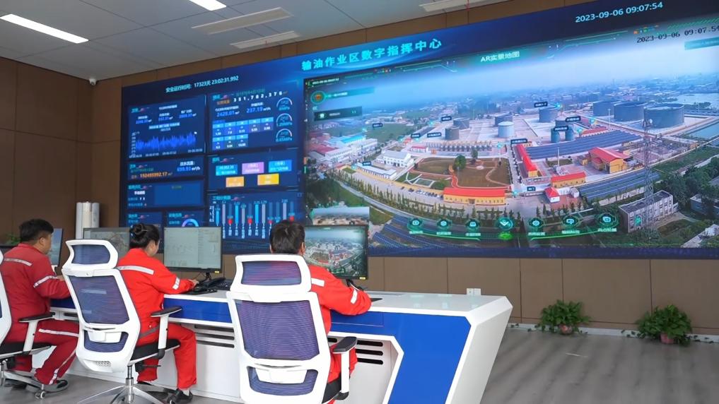 在河北省任丘市華北油田第一采油廠(chǎng)輸油作業(yè)區區域指揮中心,大屏上顯示著(zhù)油水井、站場(chǎng)、管道等數據信息。利用“井站駕駛艙監控、云組態(tài)站控、AR實(shí)景監控、消防安保聯(lián)動(dòng)、管道運行監控”五大功能系統,使油水井、站場(chǎng)的隱患處理效率同比提高30%。