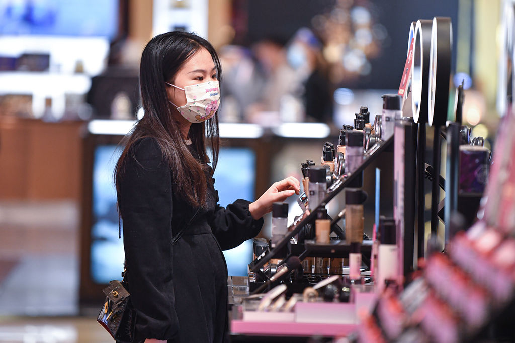 消費者在中免集團??谌赵聫V場(chǎng)免稅店選購化妝品(1月19日攝)。新華社記者 蒲曉旭 攝