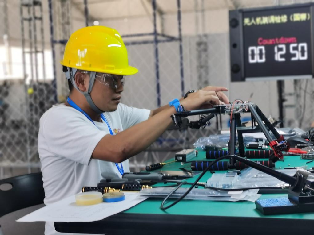 9月16日,選手參加無(wú)人機裝調檢修賽項比賽。(新華社記者 劉惟真 攝)