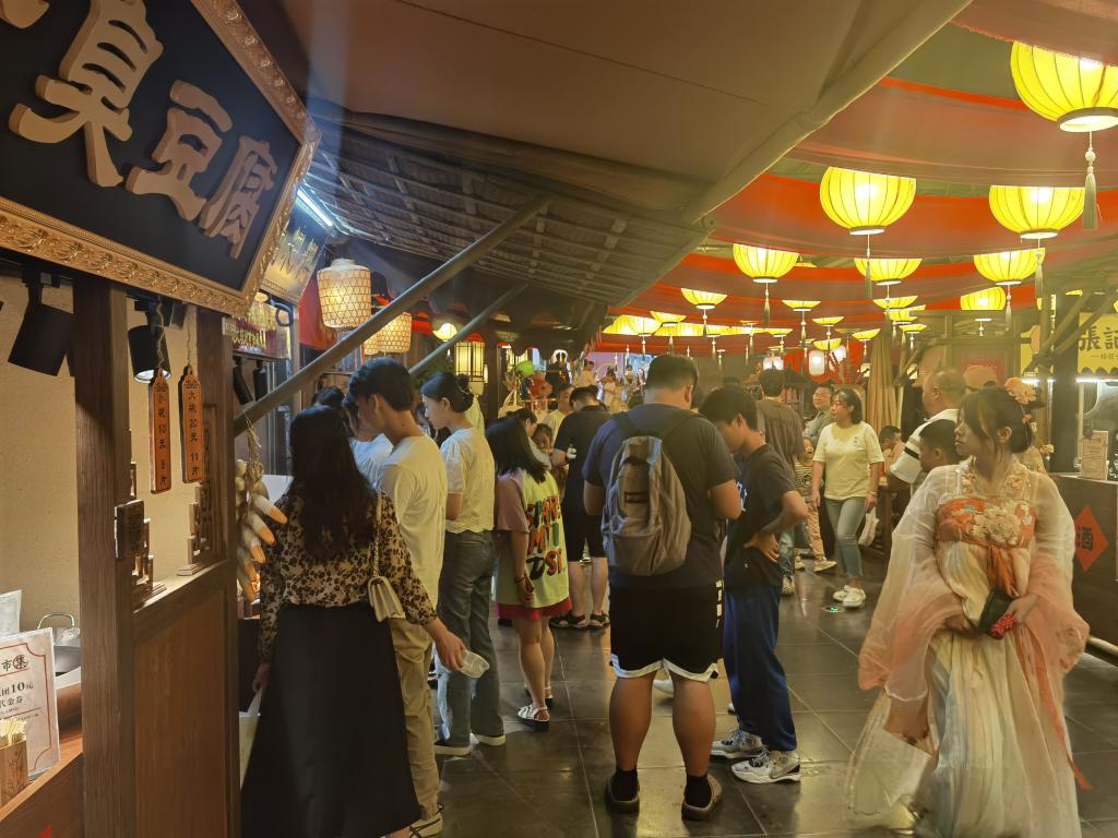 湖南長(cháng)沙天心區五一商圈一家商場(chǎng)內的潭州市集里,燈籠、木拱橋、水車(chē)等把人們帶入古代繁華夜市。市集布置了影視級仿古街景,聚集47家不同類(lèi)型的店鋪,涵蓋長(cháng)沙本地小吃、角色扮演游戲、歌舞樂(lè )器表演等,可謂“食、游、娛、演、購”俱全。