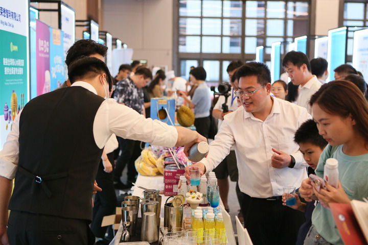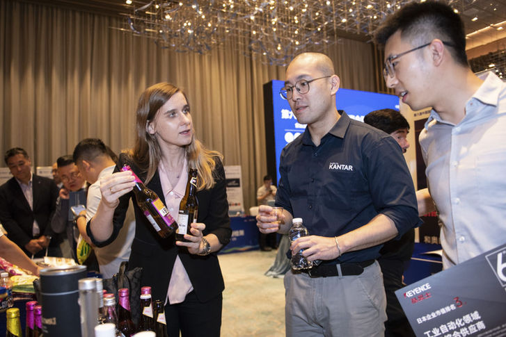 在深圳舉行的進(jìn)博會(huì )展前供需對接活動(dòng)上,波蘭投資貿易局的工作人員(左前)向采購商展示風(fēng)味啤酒(2023年8月29日攝)。新華社記者 毛思倩 攝