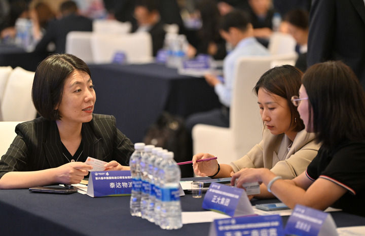 在第六屆中國國際進(jìn)口博覽會(huì )招商路演(天津)活動(dòng)現場(chǎng),參展商代表和天津的采購商代表進(jìn)行交流(2023年9月26日攝)。新華社記者 李然 攝