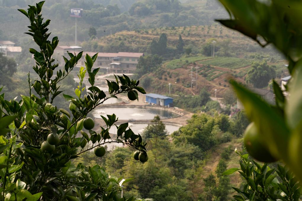 在村子里的山坳處,幾十口大水池整齊排列,用來(lái)飼養鯰魚(yú)等不同魚(yú)種,養魚(yú)產(chǎn)生的排泄物通過(guò)固液分離、蛋白質(zhì)分離、殺菌增氧等處理發(fā)酵后作為有機肥供果樹(shù)使用,凈化后的水用于澆灌血橙或養殖再利用。
