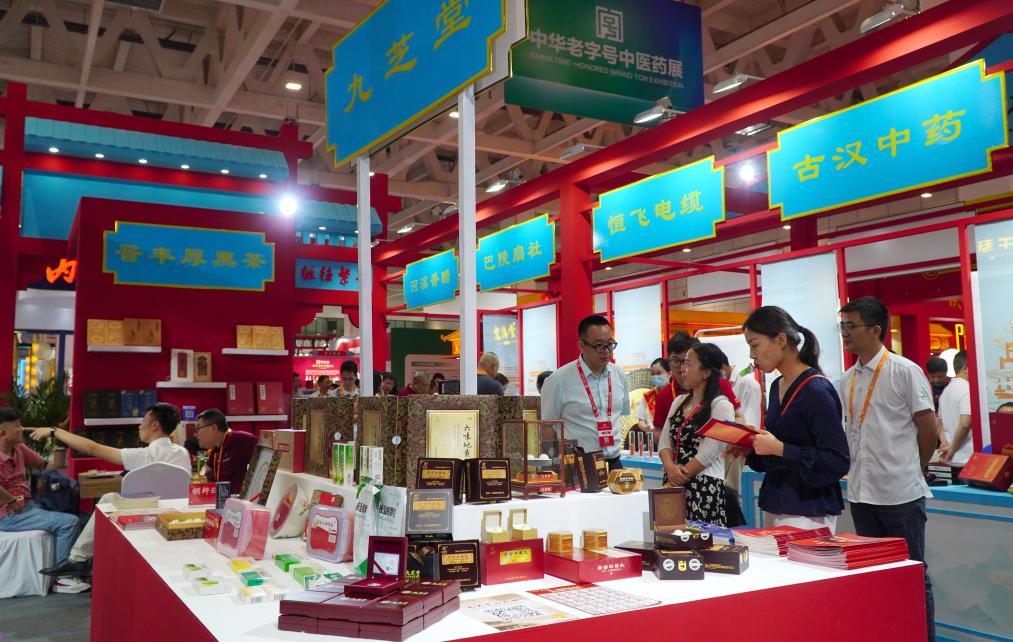 6月9日,在第七屆中華老字號(山東)博覽會(huì )上,人們在湖南展區參觀(guān)。新華社記者徐速繪 攝