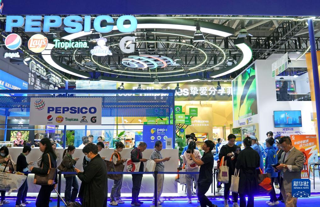 2023年11月8日在第六屆進(jìn)博會(huì )食品及農產(chǎn)品展區拍攝的百事公司展臺。今年是百事公司首次參展進(jìn)博會(huì )。新華社記者 劉穎 攝