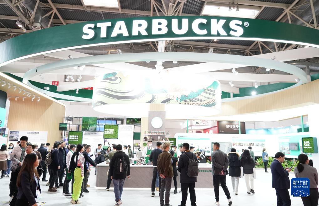 這是在首屆中國國際供應鏈促進(jìn)博覽會(huì )健康生活鏈展區拍攝的星巴克展位(2023年11月28日攝)。新華社記者 任超 攝