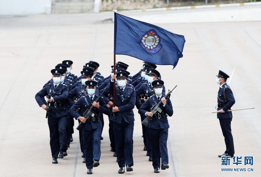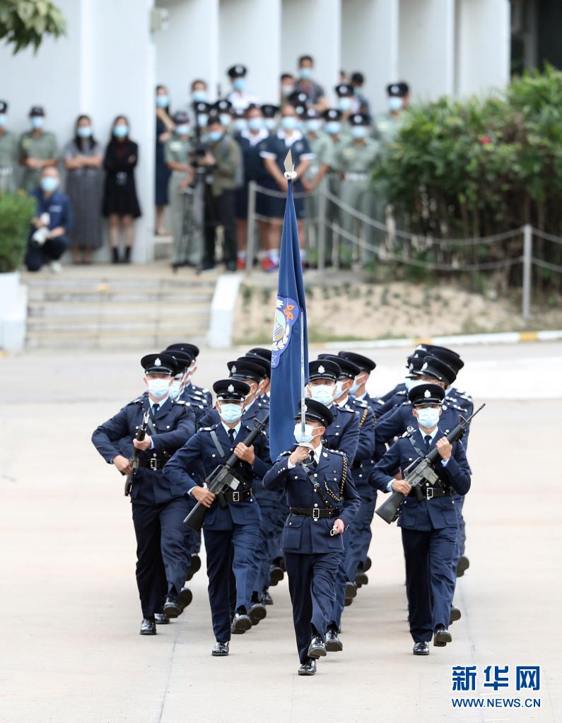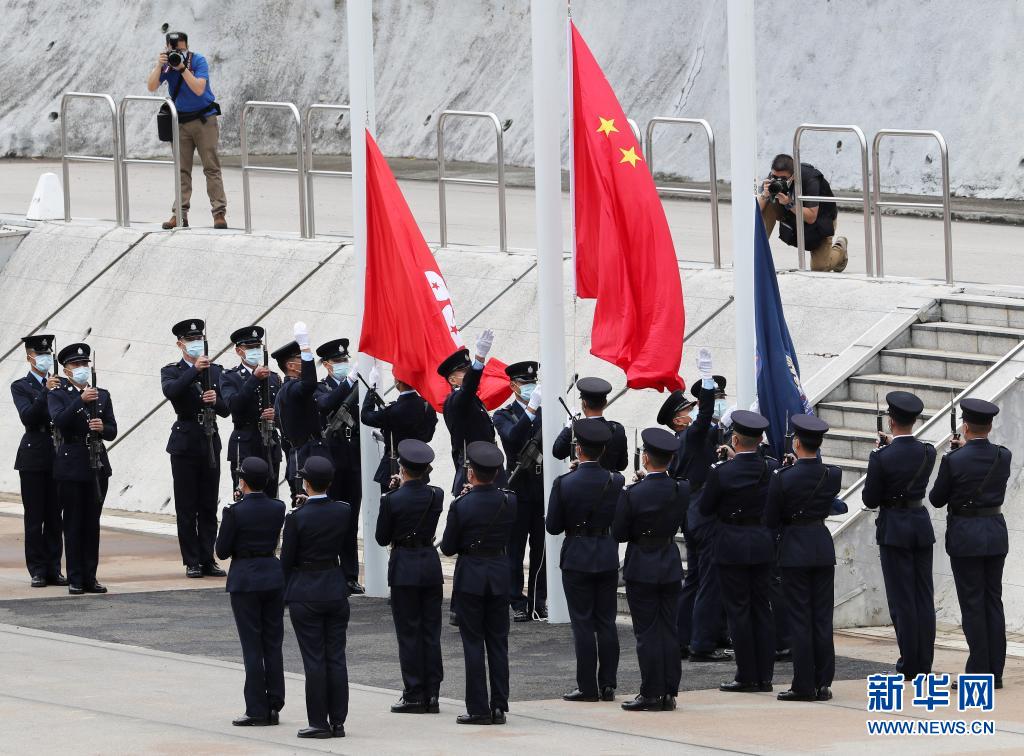 鮮艷的五星紅旗,被香港警察學(xué)院升旗手奮力一揮,迎風(fēng)飄展,徐徐直上。