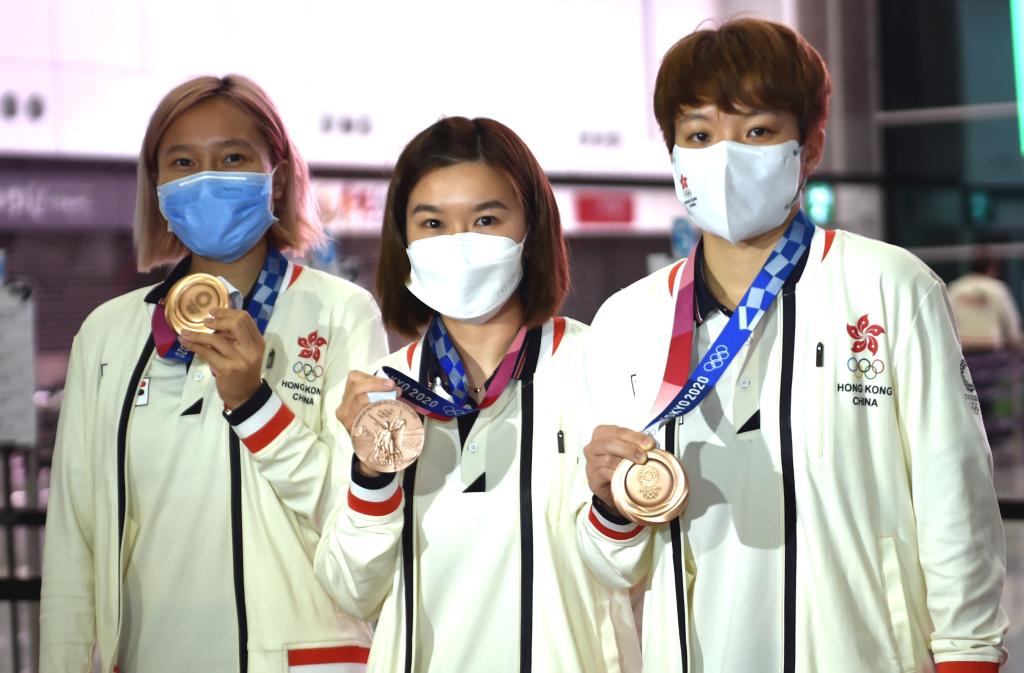 8月8日,中國香港選手杜凱琹、李皓晴、蘇慧音(由右至左)展示獎牌。新華社記者 盧炳輝 攝