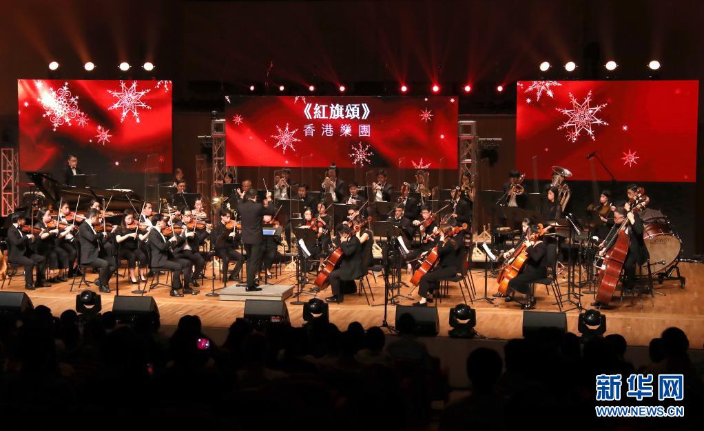 8月14日,香港樂(lè )團在音樂(lè )會(huì )上演奏《紅旗頌》。新華社記者 吳曉初 攝