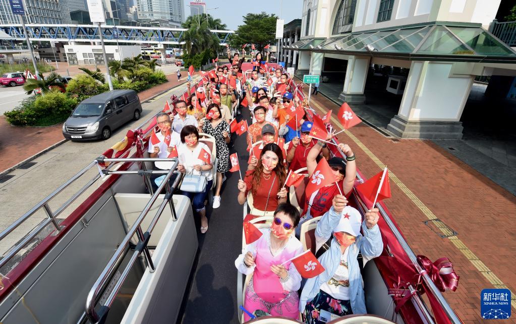 10月1日,在香港街頭,參加慶祝國慶巴士巡游的人們揮動(dòng)國旗和香港特區區旗。新華社記者 盧炳輝 攝