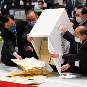 12月19日,香港特區選舉管理委員會(huì )主席馮驊(右二)打開(kāi)票箱。新華社記者 呂小煒 攝