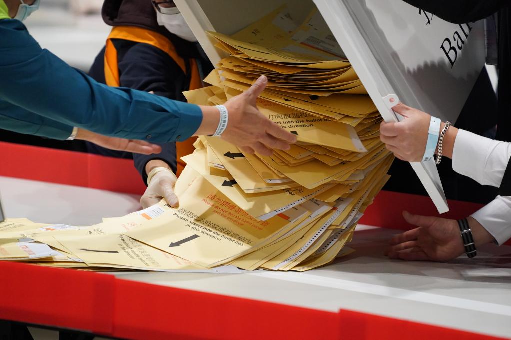 12月19日,香港順利舉行完善選舉制度后首次立法會(huì )選舉投票,工作人員點(diǎn)票現場(chǎng)。新華社記者 呂小煒 攝