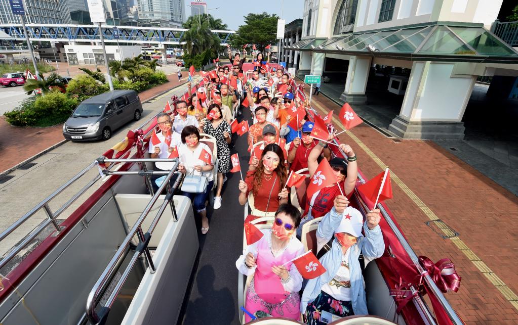 10月1日,在香港街頭,參加慶祝國慶巴士巡游的人們揮動(dòng)國旗和香港特區區旗。新華社記者 盧炳輝 攝