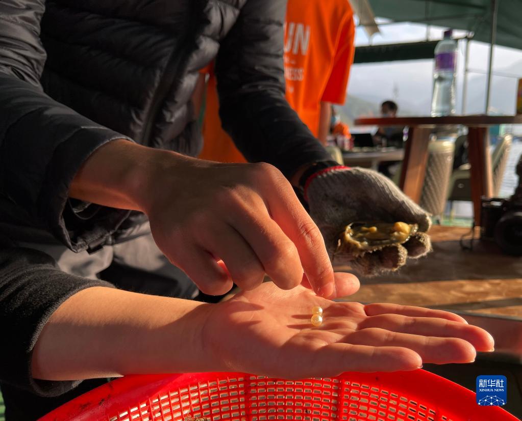 漁民向記者展示養殖的珍珠(1月27日攝)。新華社記者 李鋼 攝