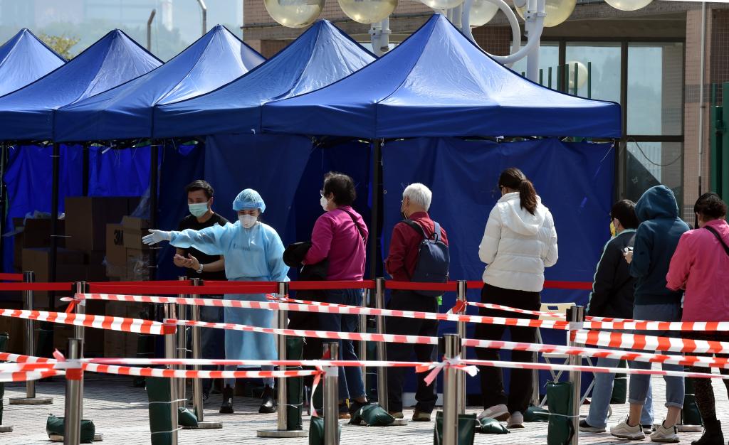 2月27日,在香港青衣流動(dòng)檢測站,市民排隊進(jìn)行核酸檢測。新華社記者 盧炳輝 攝