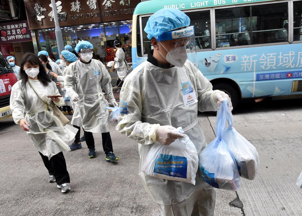 4月2日,在香港荃灣,佩戴口罩的義工向市民派發(fā)“防疫服務(wù)包”。新華社記者 盧炳輝 攝