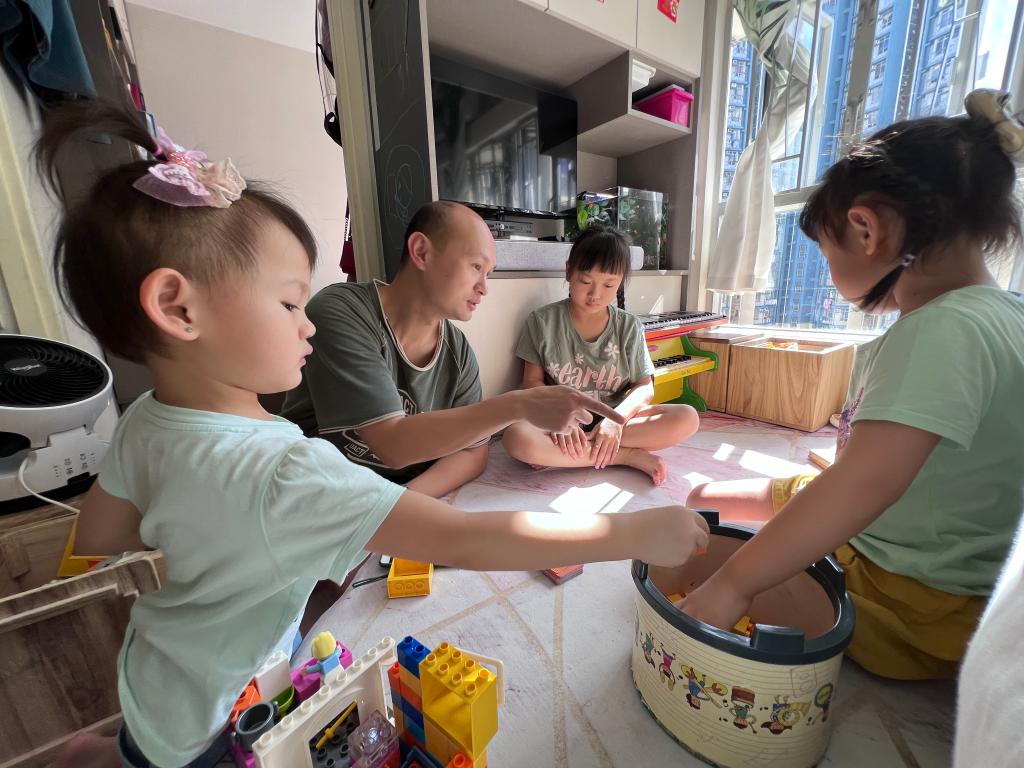 周老師的丈夫彭先生帶著(zhù)三個(gè)女兒搭積木(3月31日攝)。新華社記者 張玥 攝