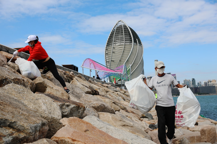 2021年12月7日,義工在香港海邊撿垃圾。新華社記者吳曉初 攝
