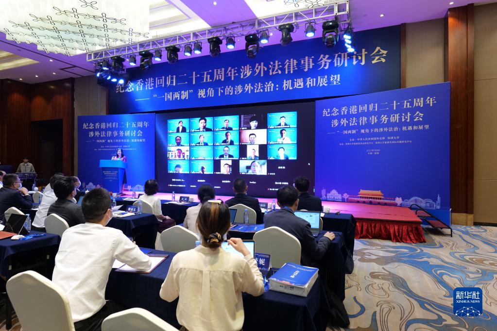 6月9日,由外交部與深圳大學(xué)主辦的“‘一國兩制’視角下的涉外法治:機遇與展望——紀念香港回歸二十五周年涉外法律事務(wù)研討會(huì )”在北京、深圳以線(xiàn)上線(xiàn)下相結合的方式舉辦。這是深圳會(huì )場(chǎng)。新華社記者 王豐 攝