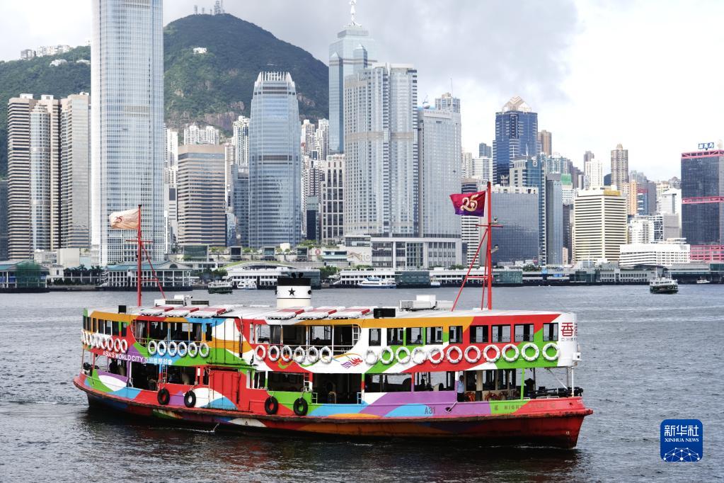 在香港尖沙咀天星碼頭,天星小輪載著(zhù)慶祝香港回歸祖國25周年標志的旗幟在維港航行(2022年6月22日攝)。新華社記者 王申 攝
