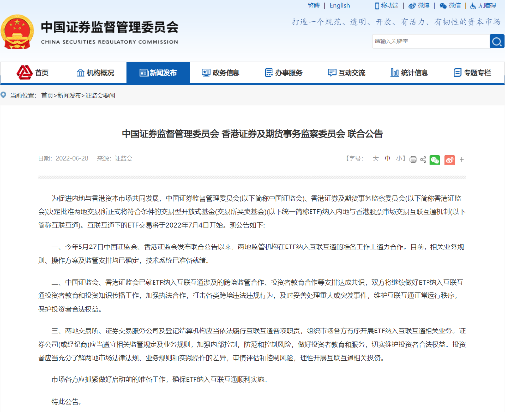 中國證監會(huì )、香港證監會(huì )28日宣布,互聯(lián)互通(內地與香港股票市場(chǎng)交易互聯(lián)互通機制)下的ETF(交易型開(kāi)放式基金)交易將于2022年7月4日開(kāi)始。