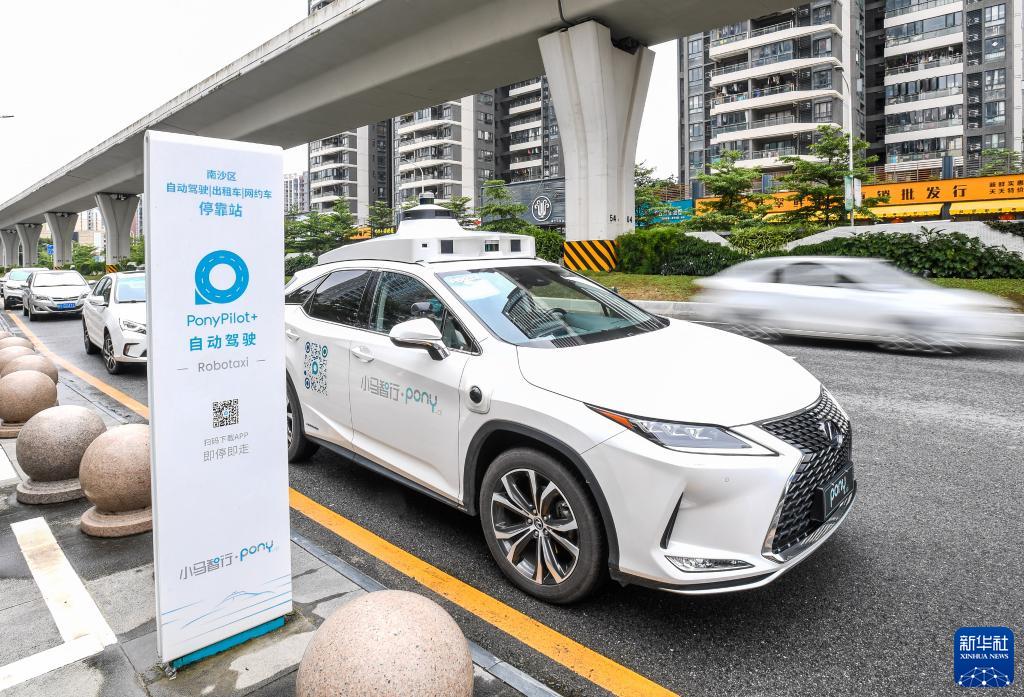 一輛由小馬智行運營(yíng)的自動(dòng)駕駛出租車(chē)在廣州南沙一個(gè)自動(dòng)駕駛??空镜却丝停?022年6月15日攝)。新華社記者 劉大偉 攝