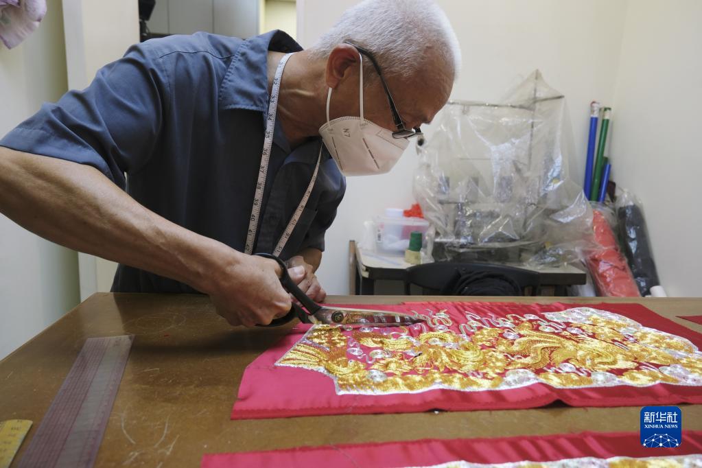 一位師傅在位于香港九龍的冠南華店中刺繡(9月27日攝)。新華社記者 王申 攝