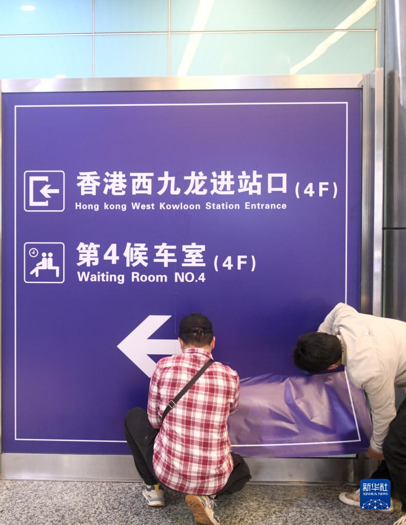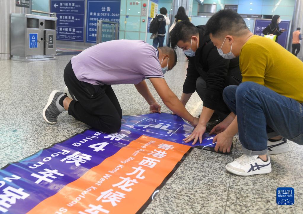 1月12日,工作人員在廣州東站張貼廣深港高鐵候車(chē)室指引標識。新華社記者 盧漢欣 攝