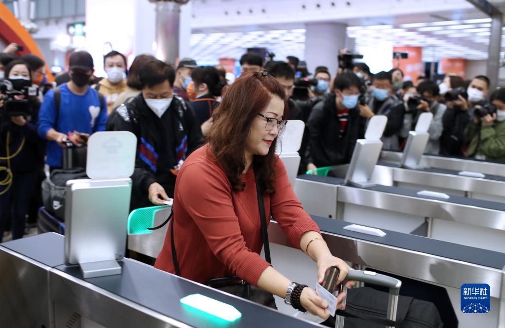 1月15日,在深圳北站,搭乘恢復通車(chē)后內地駛往香港首趟列車(chē)G5607次的乘客通過(guò)閘機進(jìn)站。新華社記者 毛思倩 攝